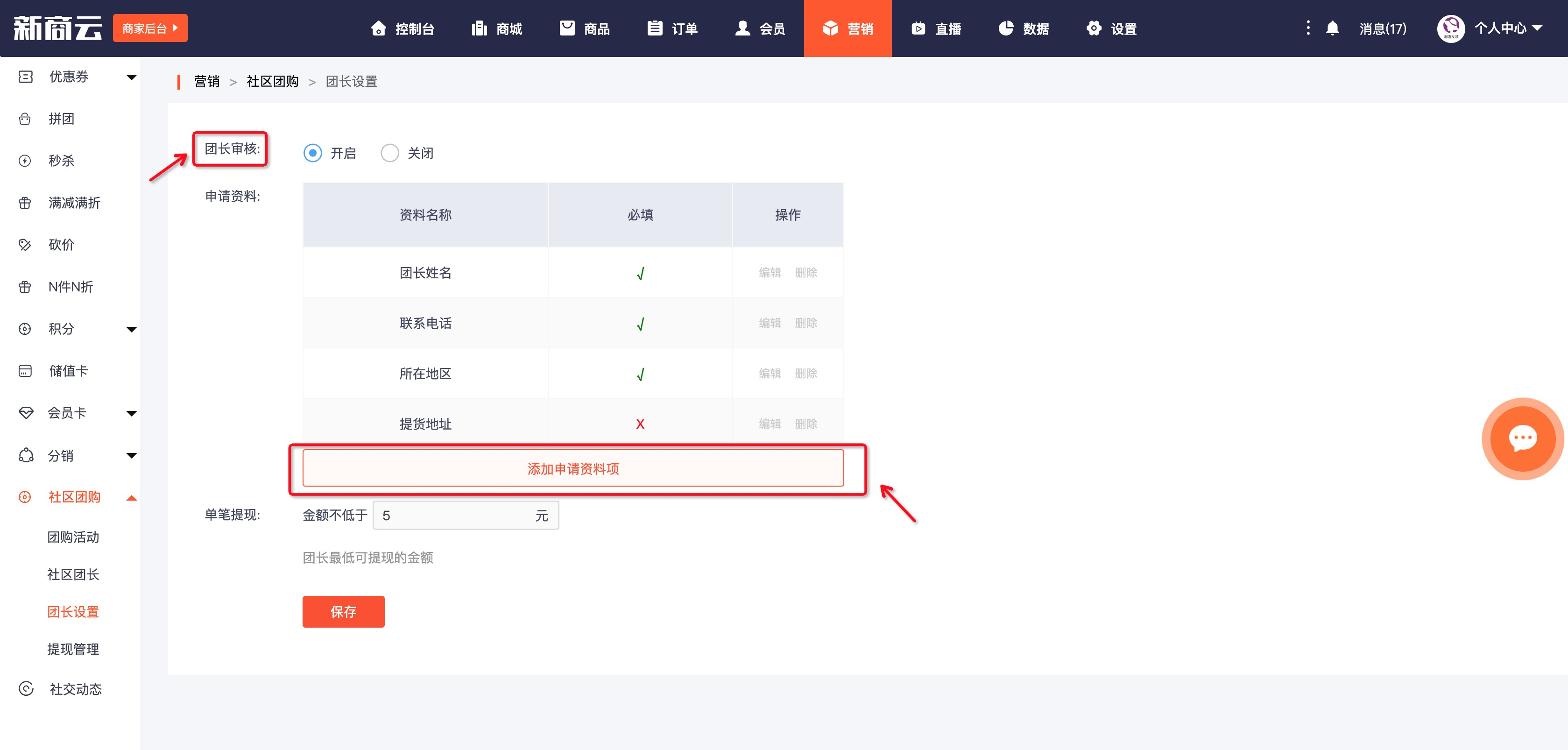 在团长设置中,可以选择开启团长审核或者关闭,开启后会员申请团长需要先通过团长的审核,关闭后会员申请团长不需要平台审核即可成为商城内的团长。