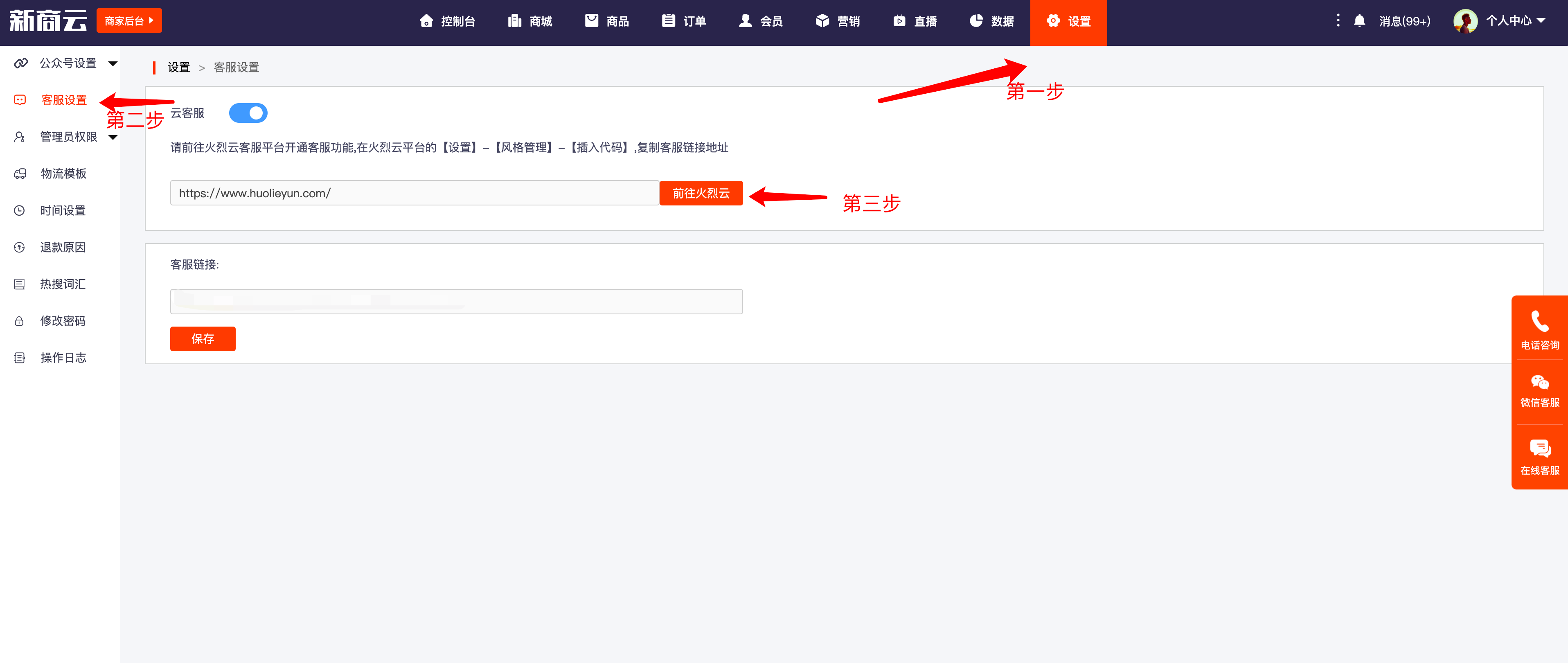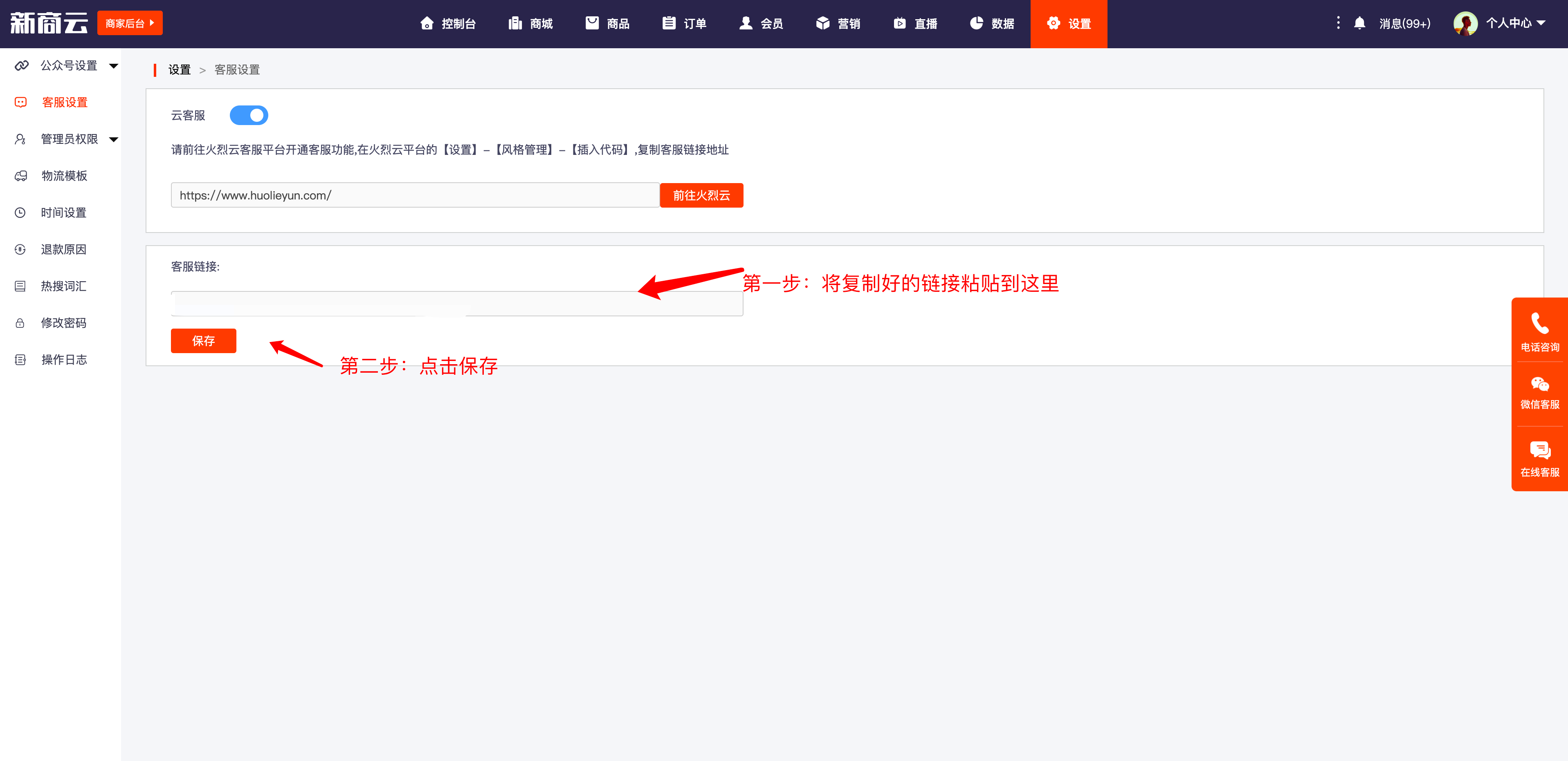 4、将复制的链接粘贴到“新商云”屏幕上方的位置,点击“保存”