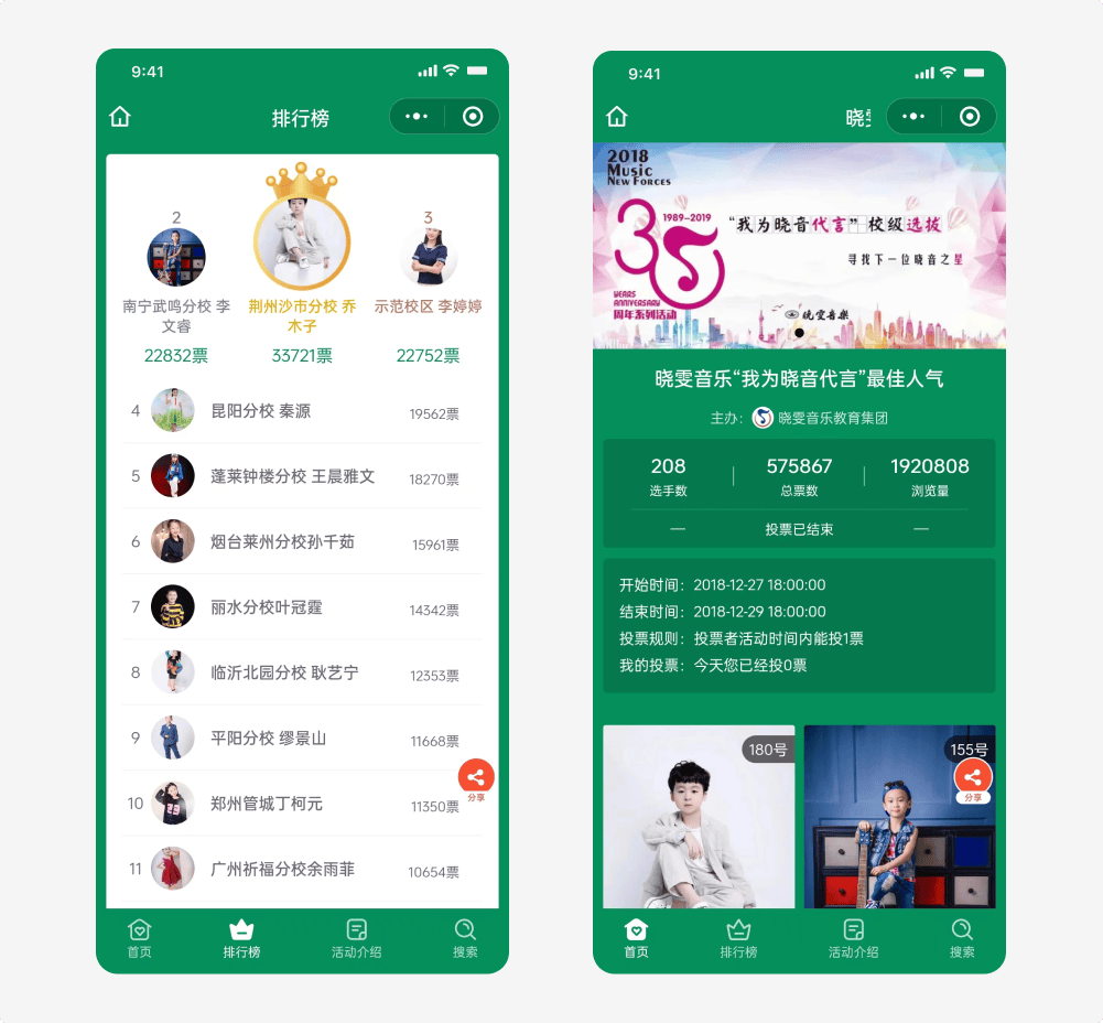 案例二:晓雯音乐教育集团举办了晓雯音乐“我为晓音代言”最佳人气投票活动,在活动举办期间,浏览量和参与量都达133.4万。
