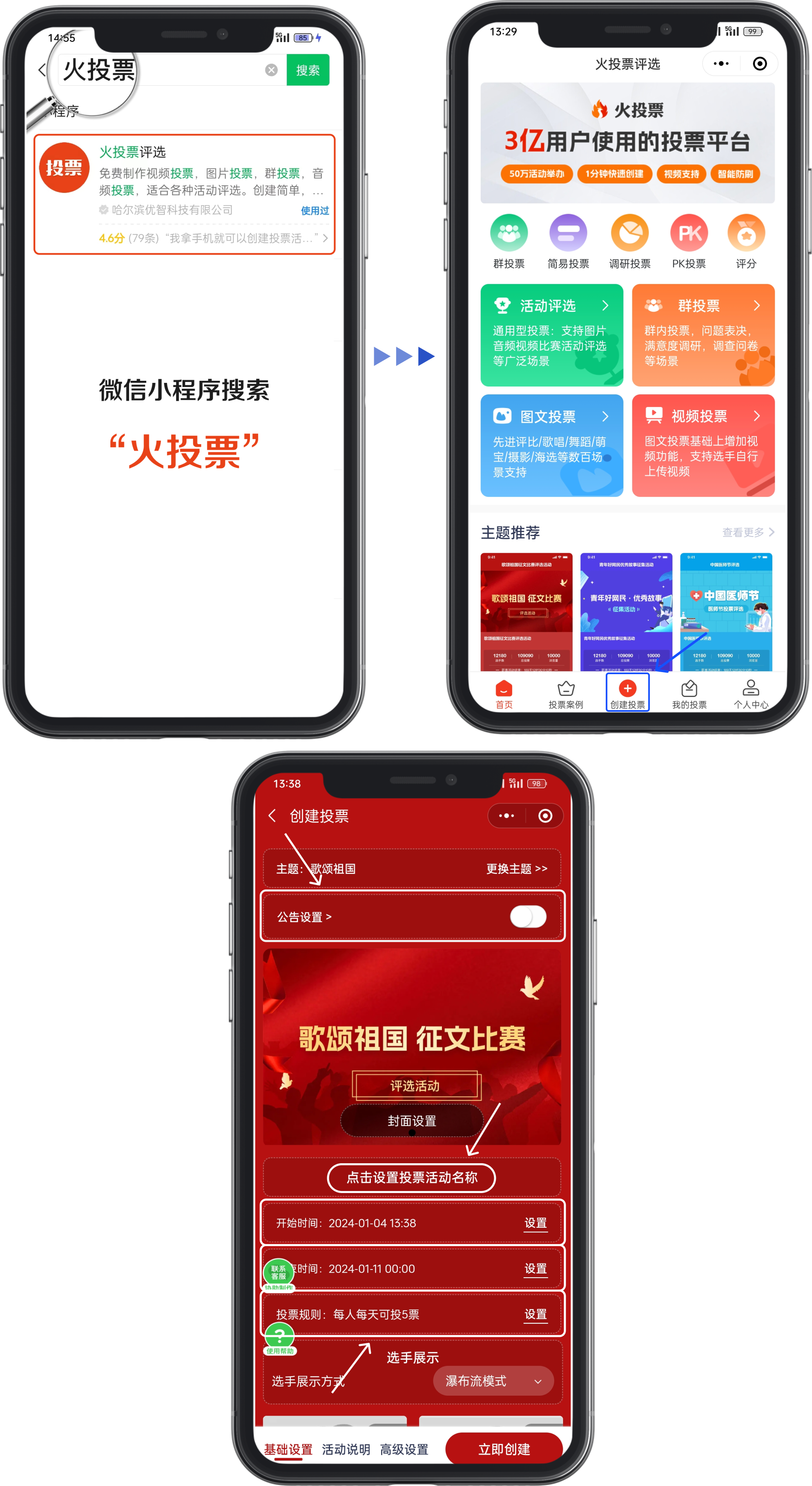 进入小程序选择投票模式,然后选择投票模板,填写相关信息,如:举办品牌投票活动的时间,活动说明,奖励说明,点击创建即可完成。