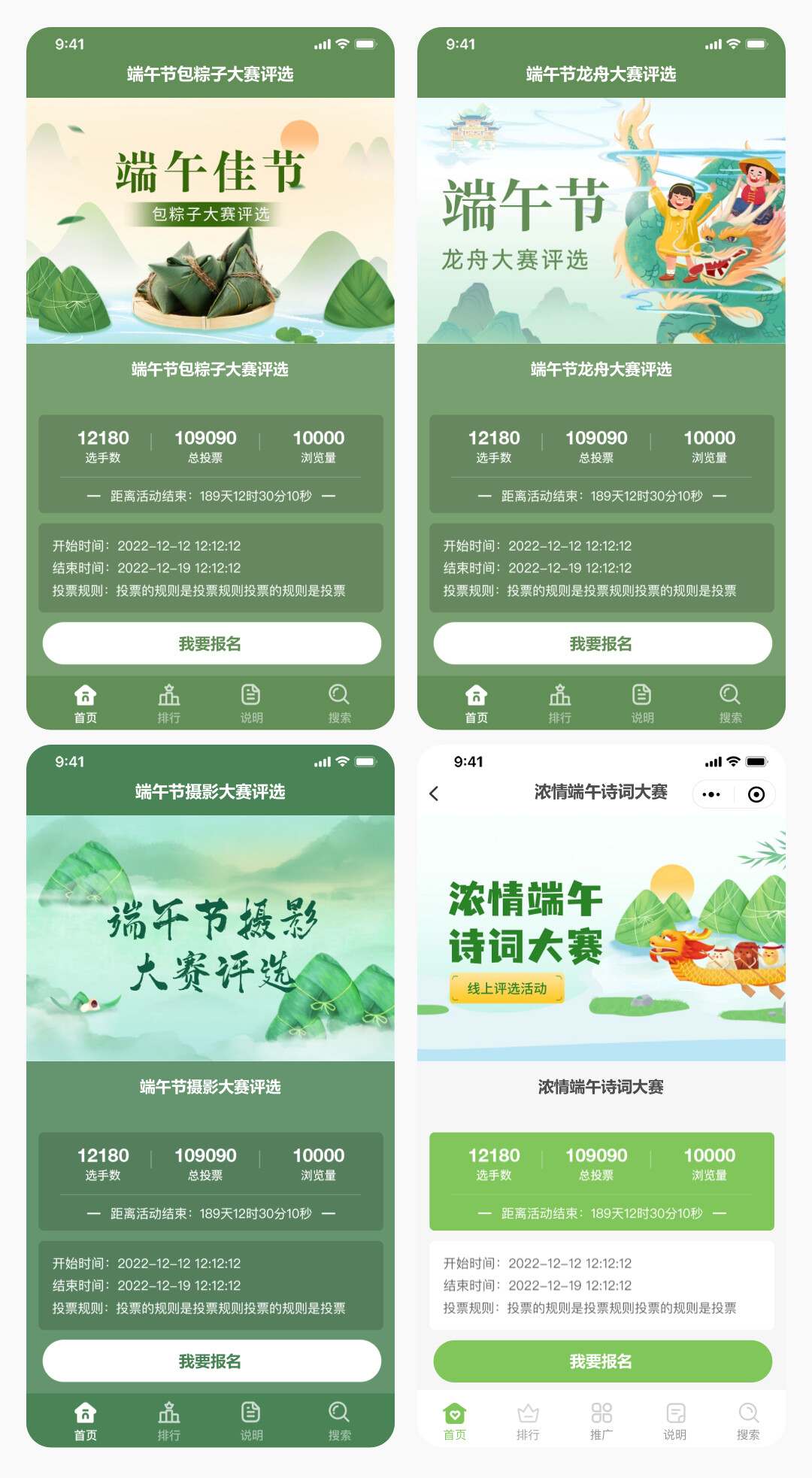 以上4套主题适合:端午节摄影大赛投票评选活动,同时也可以找到客服,帮您制作更佳好看的封面来适合更多的端午节摄影投票评选活动相关比赛。