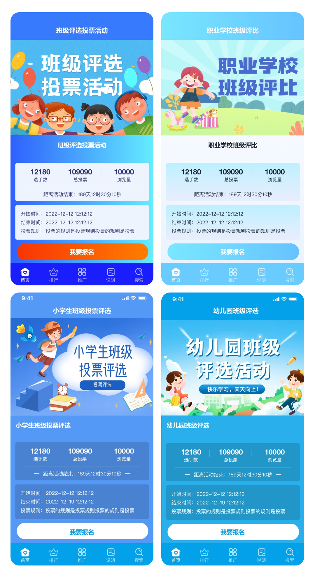 上面4套主题适合班级评选投票活动,同时也可以找到客服帮您制作好看的封面来适合更多和班级评选相关的投票评选活动方案。