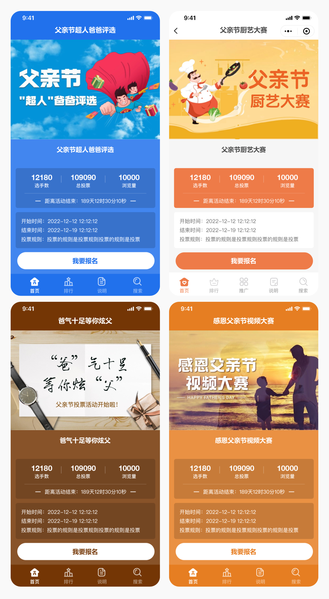 上面4套主题适合父亲节投票评选活动,同时也可以找到客服帮您制作好看的封面来适合更多的父亲节相关的投票评选活动。