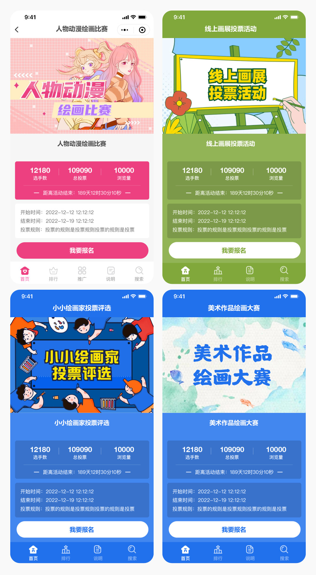 1.人物动漫绘画比赛,2.线上画展投票活动,3.小小绘画家投票评选,4.美术作品绘画大赛