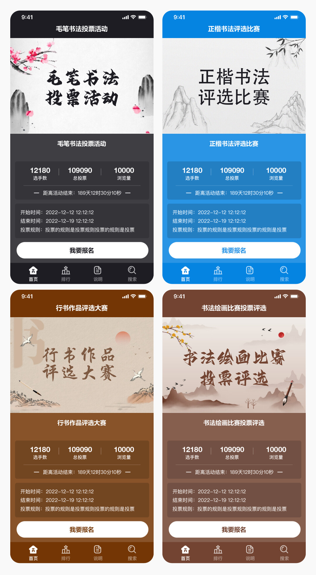 以上4套主题适合:书法绘画比赛评选活动,同时也可以找到客服,帮您制作更加好看的封面来适合更多的书法绘画比赛评选活动相关比赛。