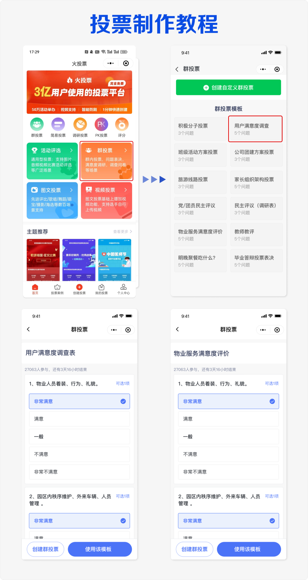 2、进入 火投票 小程序 选择 群投票,在群投票里,有很多模板,用户在使用的时候,可以自己选择模板,也可以创建自定义群投票。选择”用户满意度调查“,设置群投票的选项、投票名称、投票说明等。