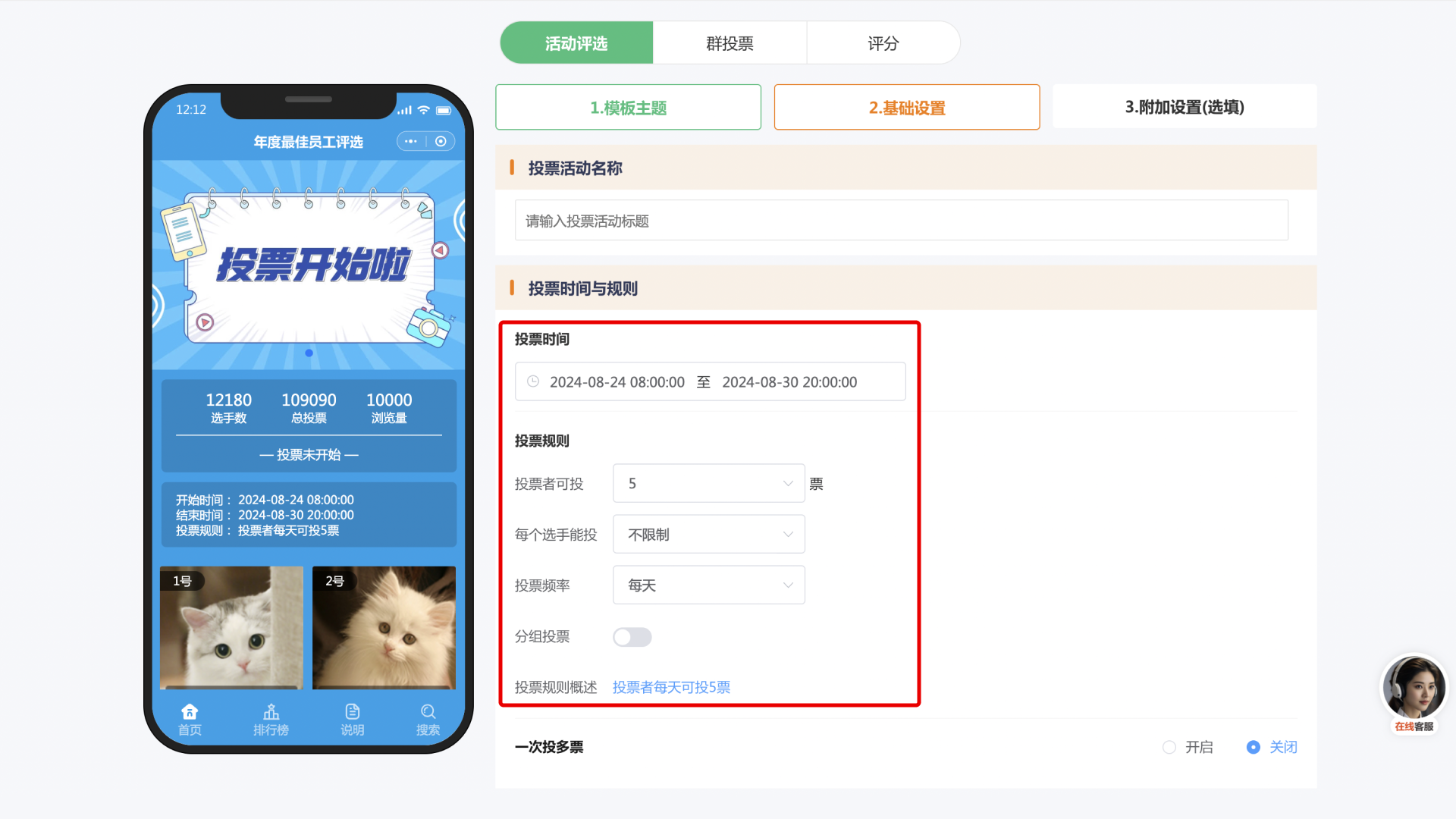 Step2:活动内容与设置。基本信息方面,为活动取个有吸引力的名字,撰写详尽的活动介绍,确定投票的时间区间。
