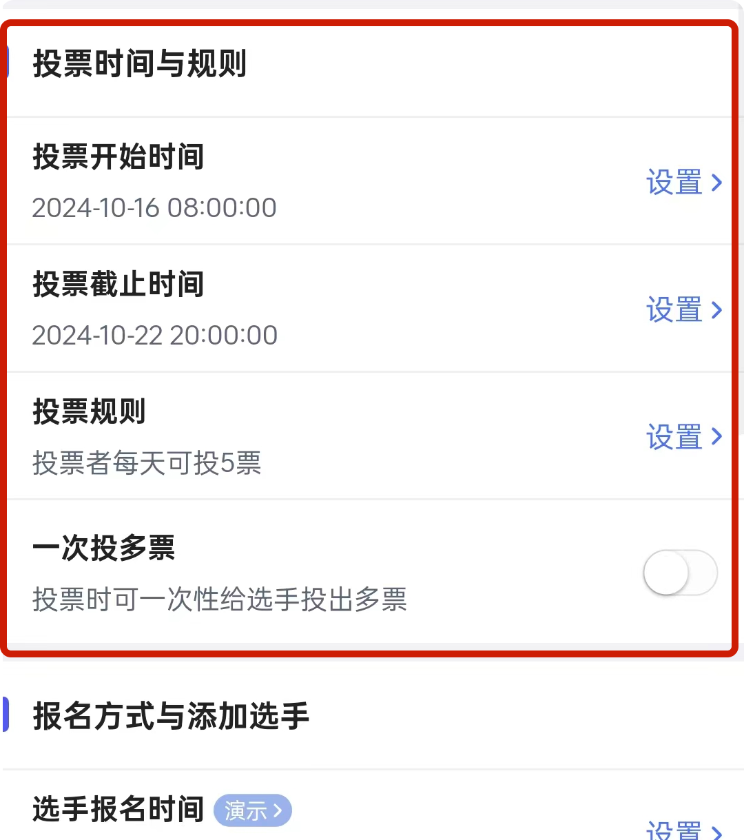 高级设置:这一设置面向投票创建者,创建者可以设置选手报名信息、主办方设置等。