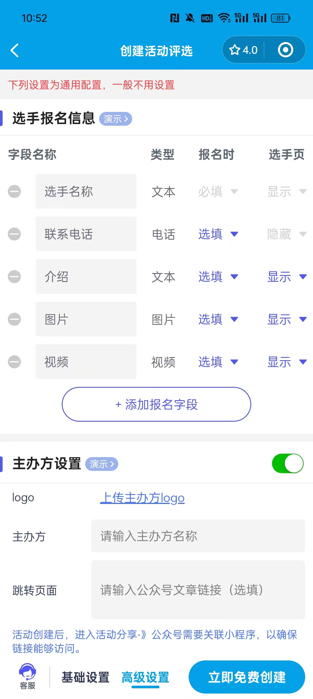 高级设置:这一设置面向投票创建者,创建者可以设置选手报名信息、主办方设置等。