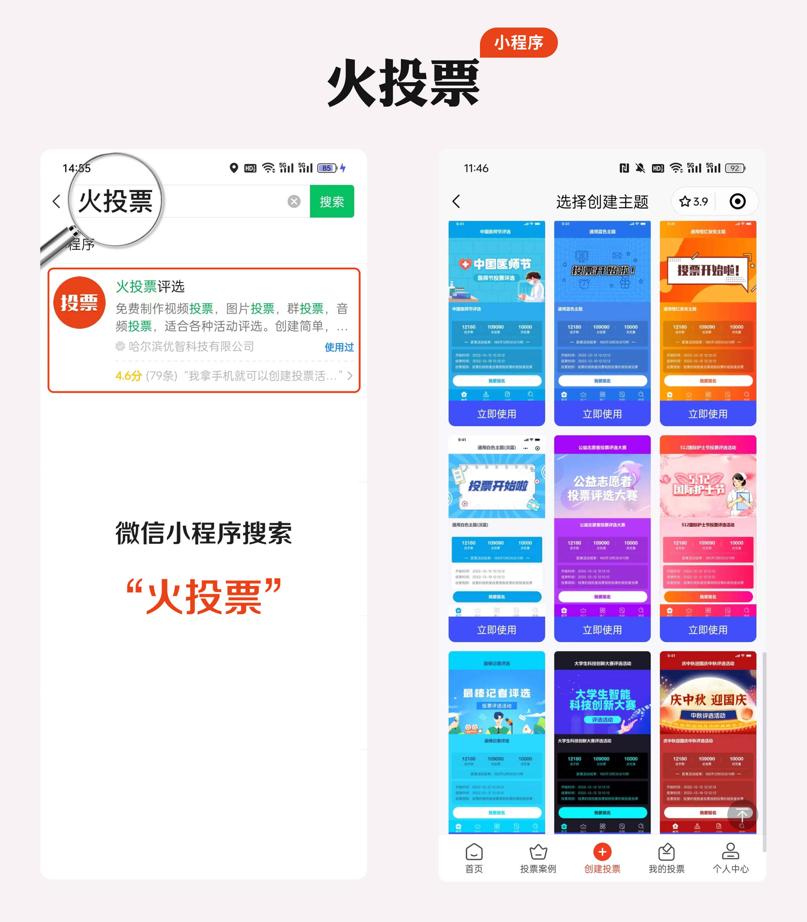 (1)确定投票工具:搜索火投票小程序,该小程序提供了丰富的模板供您选择。