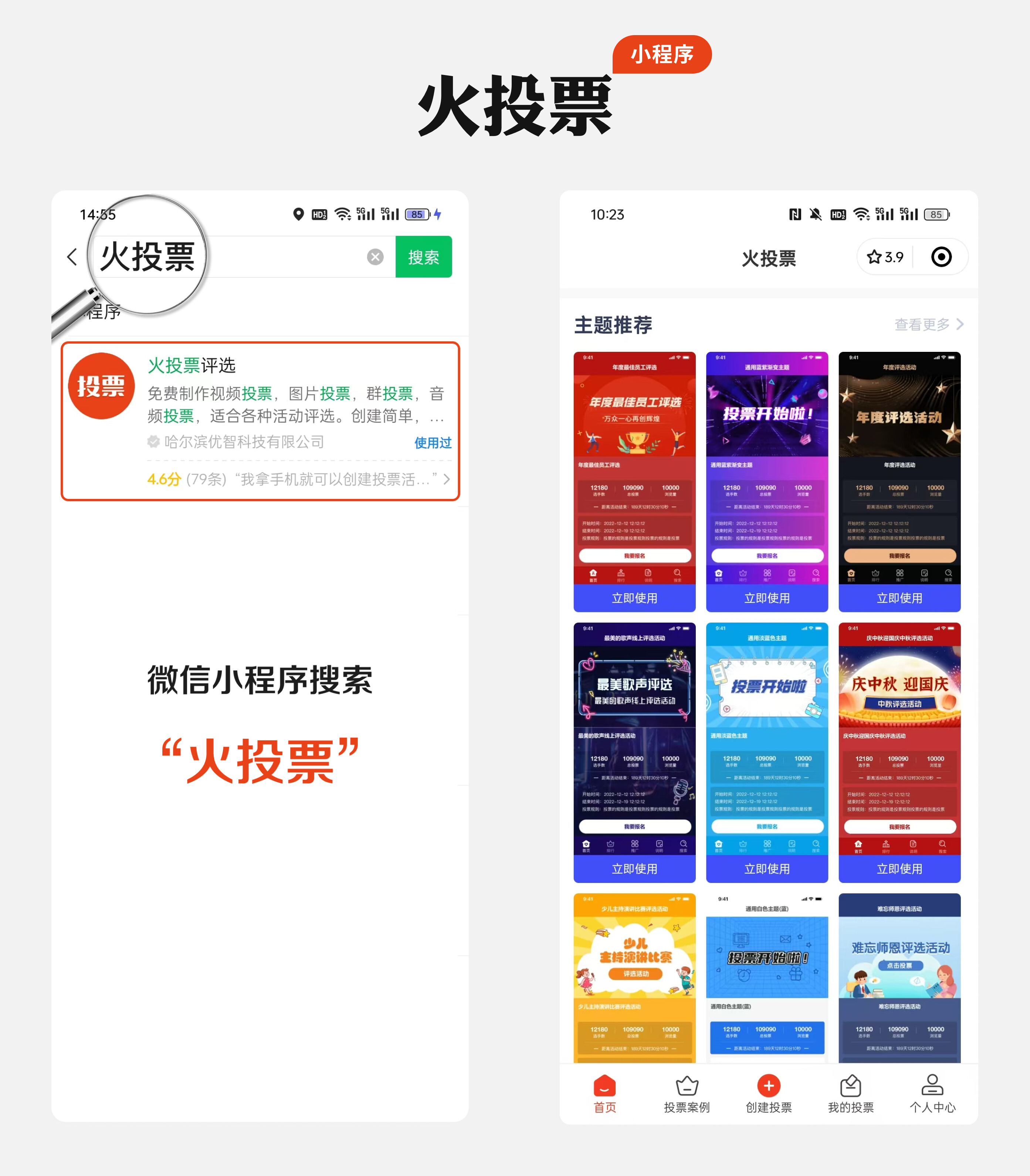 打开火投票小程序,首页“评选专区”里藏着针对不同场景的现成模板:评人的、评作品的、评方案的。选择模板后,系统会自动匹配基础设置,比如评人模板默认带“事迹介绍”栏,评作品模板默认开启“多图展示”。给评选起个直白的标题,比如“2024年小区绿化能手评选”“部门季度创新方案投票”,标题里带上核心信息,让参与者一眼就知道“评什么”。
